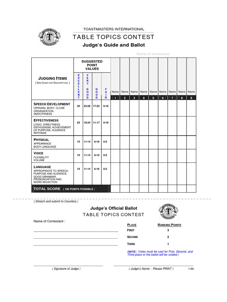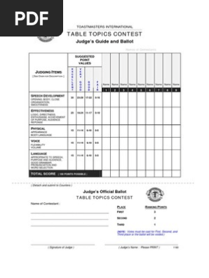 Toastmasters table topics evaluation form. There are times when you would feel i would rather have been a table topics speaker instead of a table topics evaluator. Normally in a 15 minute table topics session you will have about 6 8 speakers to evaluate in 5 minutes. The main issue in evaluating table topics is time management.